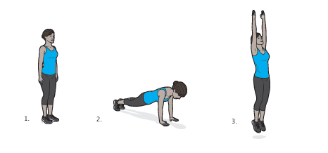 - Jump feet back to push-up position. Pause, then jump feet forward to return to squat position.