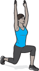 Stand with feet together. Lift arms toward ceiling, with palms facing each other. Step forward with left foot until left thigh is parallel with floor. Pause, then push back up to starting position. Do 8 to 12 times, then switch sides. Aim to do 2 to 3 sets.