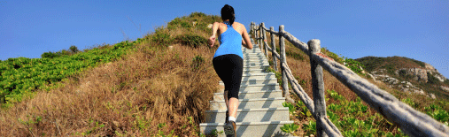 Photo: Fit woman running up a long set of outdoor stairs on a mountain