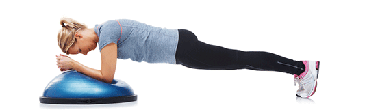 Plank Holds: With the BOSU dome side up in front of you, start from an all-fours position on the floor. Clasp your hands and place your forearms in the middle of the BOSU and let your elbows rest on the surface. Stack your shoulders over your elbows for support. Straighten your legs and lift your lower body into plank position, keeping your spine straight. Hold for 30 seconds to 1 minute, and do a total of 3 to 5 plank holds. To mix it up, flip the BOSU over so the dome side is down.