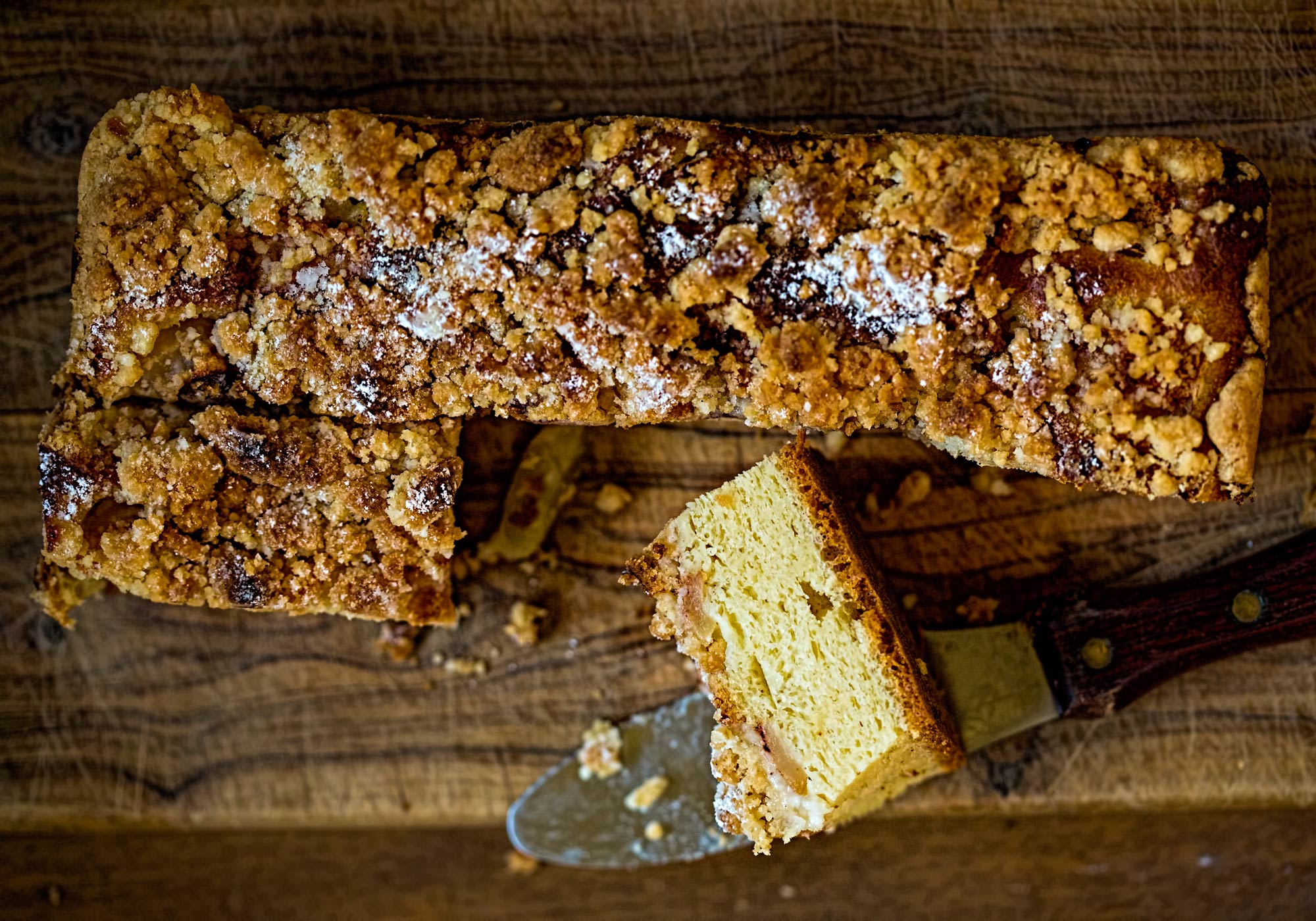 - Mix the chopped walnuts, cinnamon, and brown sugar together and spread over mix; gently pat down the streusel. Bake for 25-30 minutes or until a toothpick inserted in the center comes out clean.