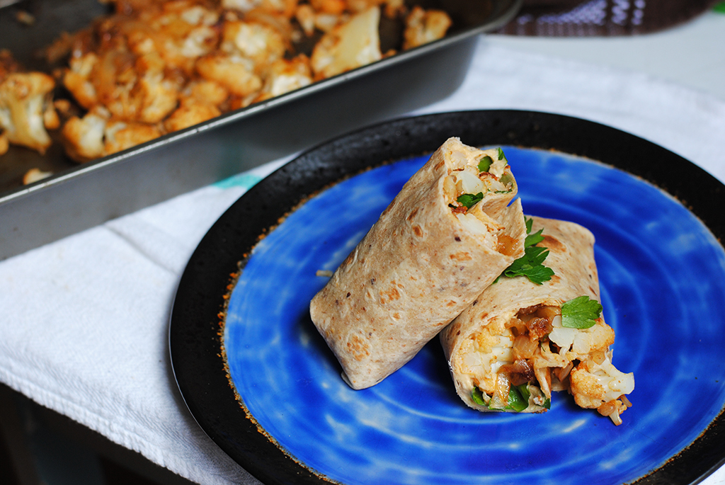 - To serve, take 1/4 of the eggplant spread and divide it among the four lavash or tortilla wraps, spreading it in a smooth layer. Divide the cauliflower amongst the wraps and arrange in an even line across each wrap. Sprinkle with parsley and mint. Roll the wraps up and enjoy. To take the wraps to go, wrap them up in wax paper.