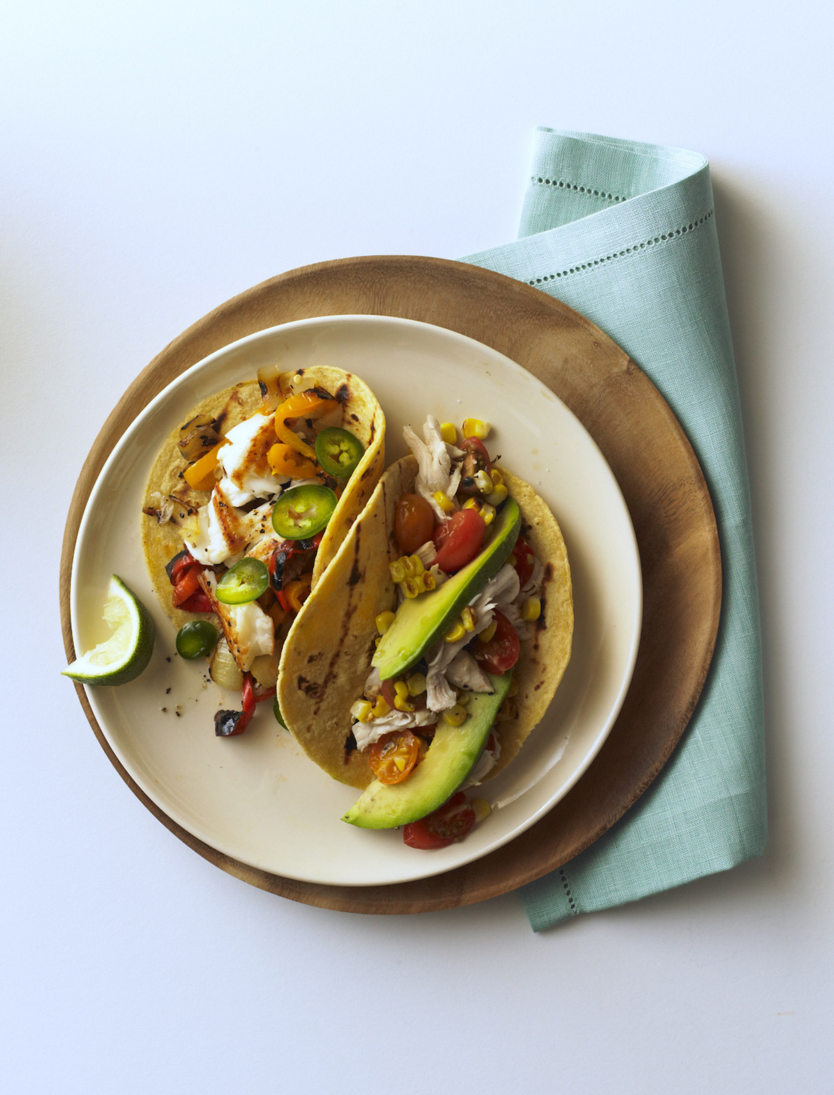 - To serve, heat the tortillas one at a time in a dry pan over medium heat, spinning the tortilla until warm. Top each with 2 tablespoons chicken, 2 slices avocado, a squeeze of fresh lime, and a sprinkle of cotija cheese.