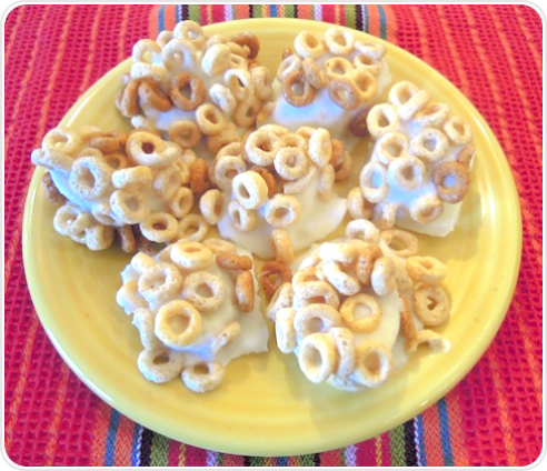 These crunchy banana bites, coated in yogurt and cereal O's, are a fun and nutritious snack perfect for kids and adults alike.