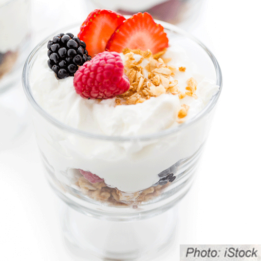 - Using 4 small containers (or cups), layer in ingredients starting with the Greek yogurt (about 1/4 cup each). Add on the berries, granola, and seeds/nuts.
